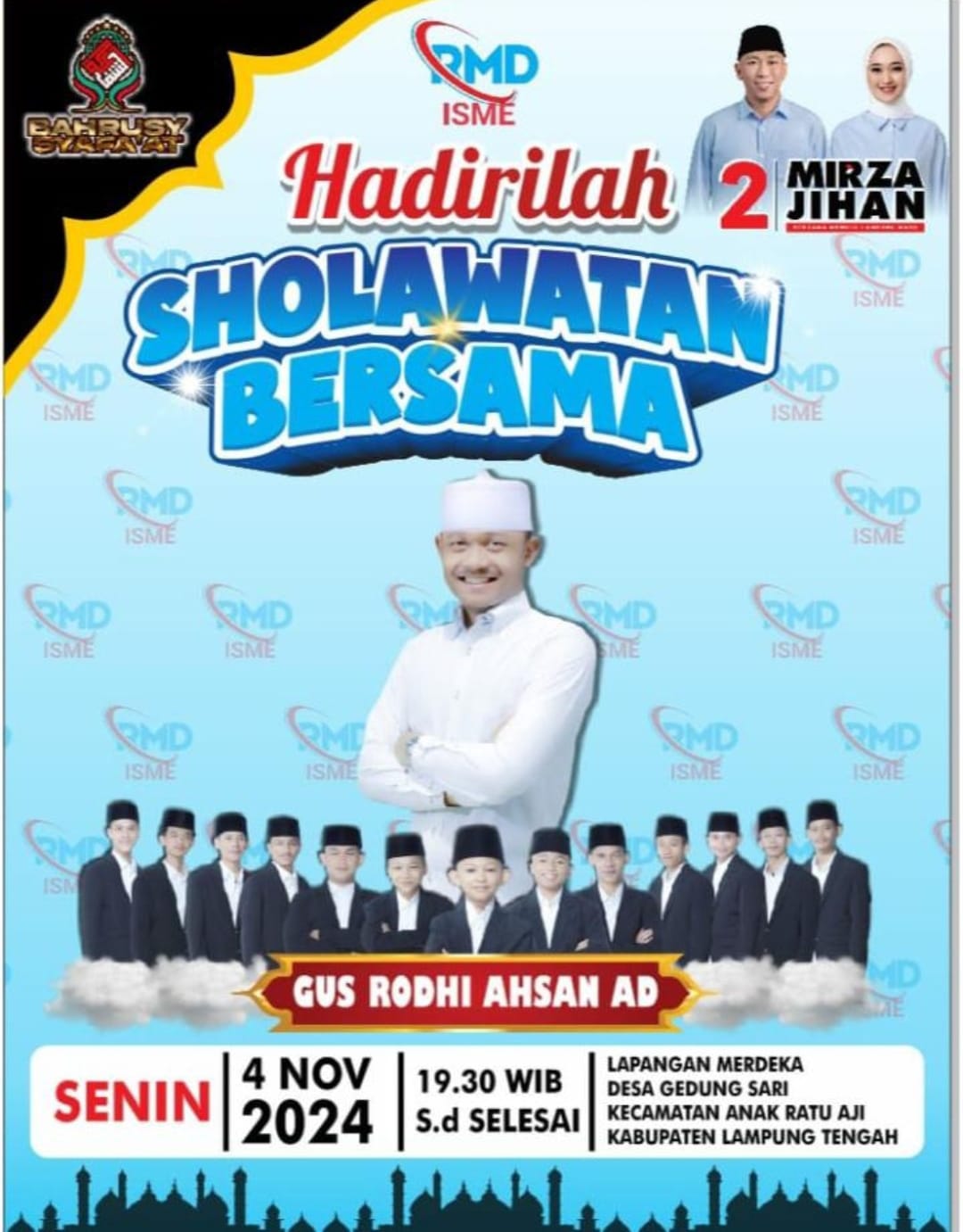 GAWAI.co.id – Relawan RMD (Rahmat Mirza Djausal) bersama Ikatan Siswa Muslim (ISME) akan mengadakan acara Sholawatan Akbar bersama masyarakat Kabupaten Lampung Tengah pada Senin malam, 4 November 2024, pukul 19.30 WIB.