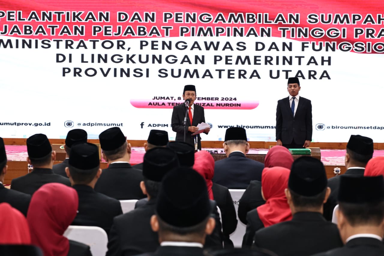 GAWAI.co.id – Penjabat (Pj) Gubernur Sumatera Utara (Sumut) Agus Fatoni diwakili Sekretaris Daerah Provinsi (Sekdaprov) Arief S Trinugriho secara resmi melantik pejabat pimpinan tinggi administrator, pengawas dan fungsional di lingkungan Pemerintah Provinsi (Pemprov) Sumut. Kegiatan ini berlangsung di Aula Tengku Rizal Nurdin, Medan, Sumatera Utara, Jumat (8/11/2024).