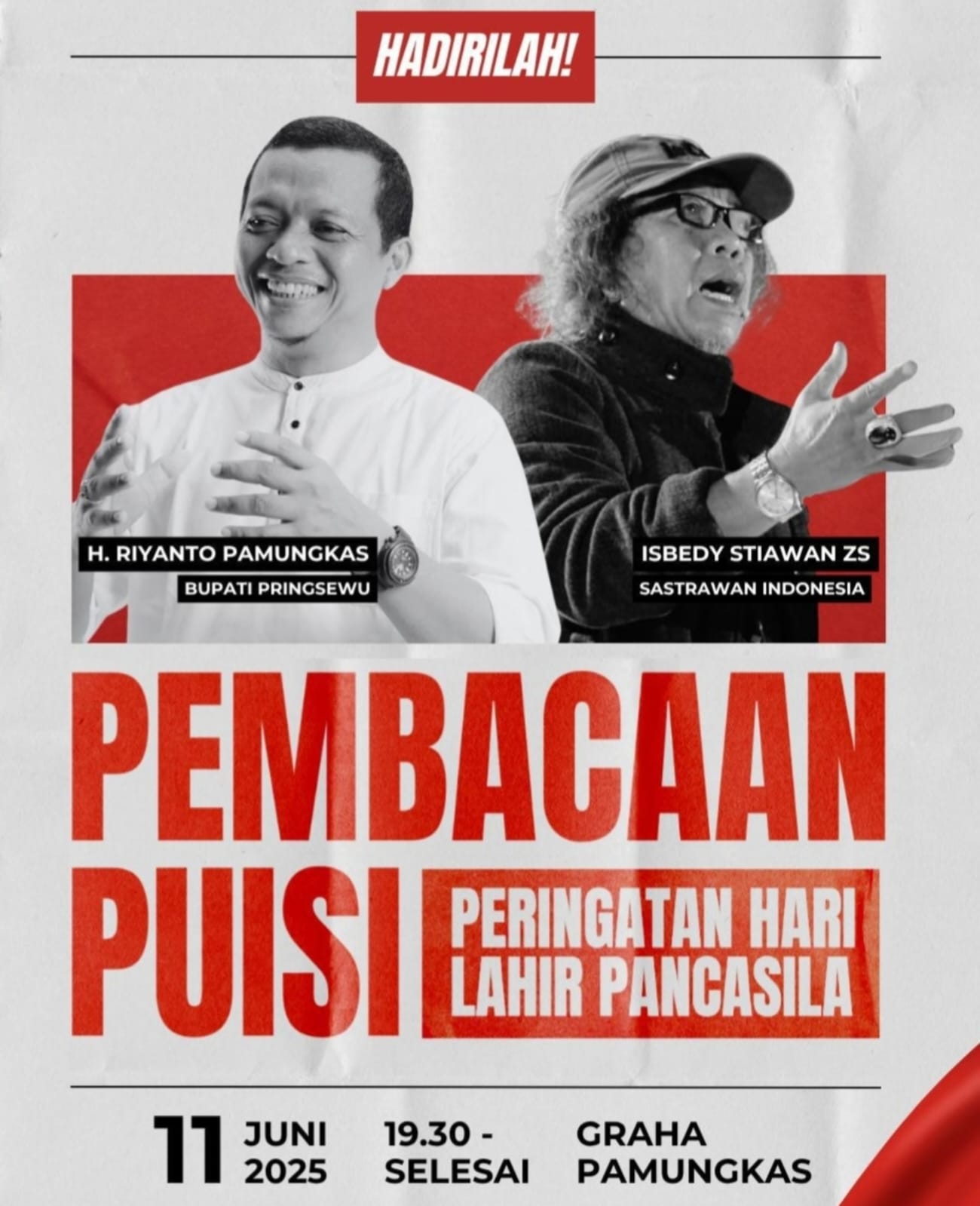 GAWAI.CO.ID – Memperingati Hari Lahir Pancasila, Bupati Pringsewu H. Riyanto Pamungkas akan “duel” dengan sastrawan nasional, Isbedy Stiawan ZS di Graha Pamungkas Pringsewu, 11 Juni 2025 pukul 19.30 sd selesai.