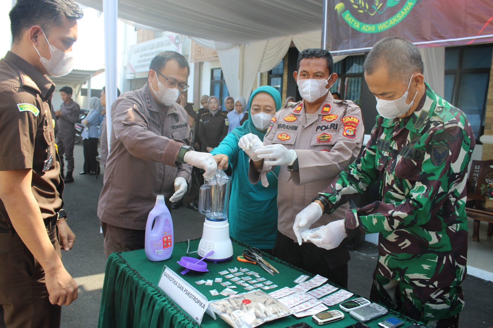 “Barang bukti kejahatan ini dimusnahkan dengan beberapa metode, seperti ponsel beserta timbangan dihancurkan dengan palu, sajam dipotong menggunakan mesin grind. Untuk narkoba jenis sabu dan pil dihancurkan dengan cara di blender” jelas Kajari.