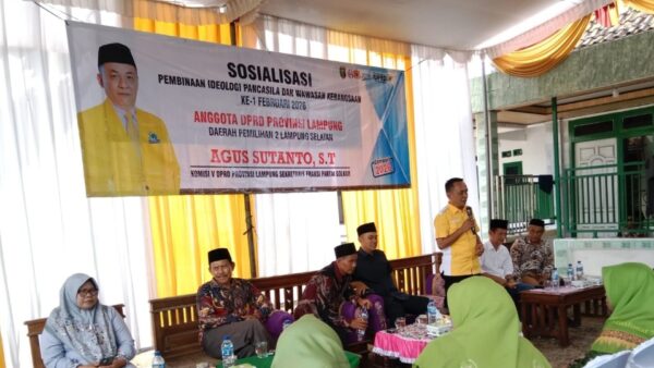 Gawai.co.id – Anggota DPRD Provinsi Lampung dari Fraksi Partai Golkar, Agus Sutanto, menggelar kegiatan Sosialisasi Pembinaan Ideologi Pancasila (PIP) dan Wawasan Kebangsaan pertama pada Februari 2026. Kegiatan tersebut berlangsung pada Minggu (08/02/2026) di Desa Way Gelam, Kecamatan Candipuro, Kabupaten Lampung Selatan.